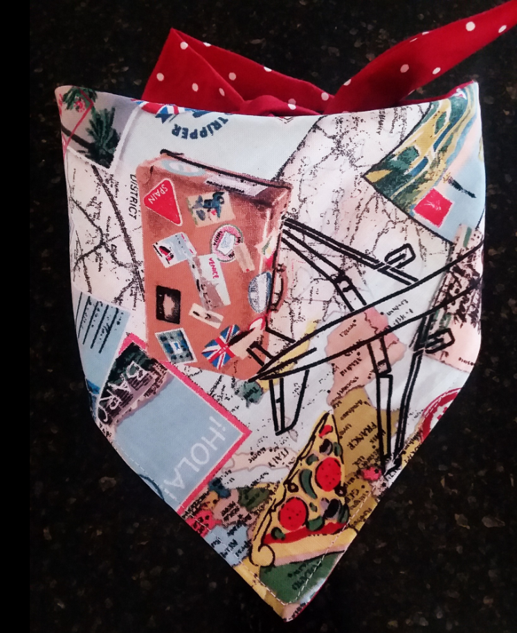 Your pup doesn't have to be a world traveler to look cute in this dog bandana. This bandana is completely reversible.